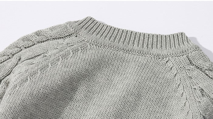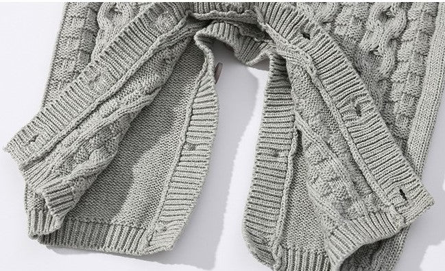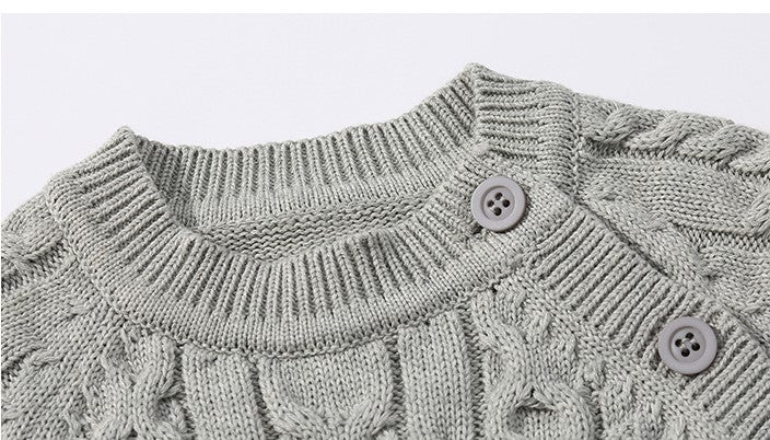 This cozy grey knitted romper features a textured cable stitch pattern that adds a stylish touch. With a classic round neck and diagonal buttons for a unique look, it ensures easy dressing and comfort. Practical button closures on the legs make diaper changes simple. Soft and versatile, this romper keeps your little one warm and effortlessly chic.